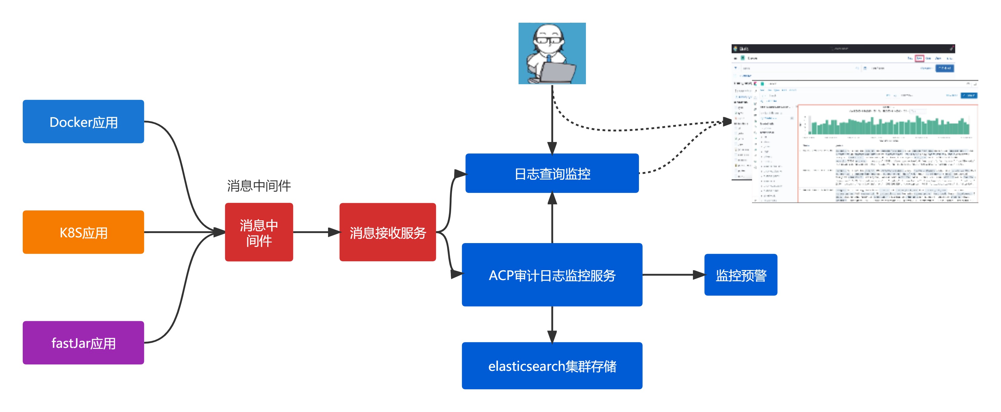 產品與es整合,支持分布式存儲服務,海量的日志統一存儲,同時可存儲多月份, 比如6個月或者1年,滿足安全審計的要求。